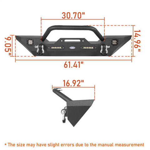 Weight: about 57 lbs; Built-in Winch Plate for up to 12,000 lbs; Two high strength D-Ring mounts, rated at 9,500 lb. D-rings w/rubber ring for reducing friction and crashing with bumper; Strong Bull Bar; Heavy Duty High Strength Steel Construction; Heavy-Duty, High Tensile 11-Gauge(1/8 Inch) Steel for the Bumper Body, 10-Gauge(9/64 Inch) Steel for the Winch Plate, 8-Gauge(11/64 Inch) Steel for the Mounting Structure Plate, and 2.0" Diameter × 0.059" Thick Steel Tubing for the Bull Bar; Textured Black Powder Coat Finish & Premium E-coating Process for Corrosion Protection Under Normal Use